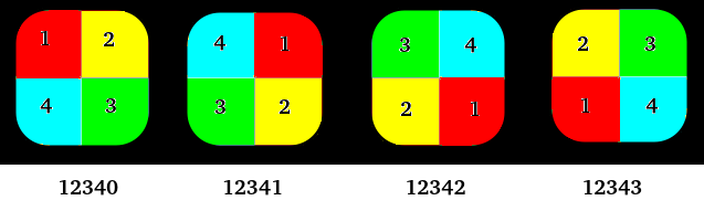 Figuur 1. Alle draaiingen van de tegel "1234". Als een speler aan de beurt is krijgt hij van de jurysoftware een gegenereerde tegel aangeboden met de vier cijfers 1,2,3,4 in willekeurige volgorde. Die leest hij in van standard input. Het eerste cijfer geeft de kleur linksboven aan voor de ongedraaide tegel, daarna ga je met de klok mee voor de andere kleuren. De speler mag zelf de draaiing van de tegel bepalen en doet dit door een cijfer 0, 1, 2 of 3 achter de tegel te plakken. Het begin van het spelBeide spelers ontvangen eerst van standard input hun geheime kleur. Er wordt een starttegel gegenereerd, die in het midden van het bord wordt geplaatst. De cel linksboven van de starttegel komt dan op plek Ff. Zie figuur 2 tegel "42130". De volgorde van de kleuren in dit voorbeeld is 4123, deze cijfers worden geplaatst met de wijzers van de klok mee, te beginnen met de 4 op positie Ff. De laatste 0 geeft aan dat de tegel niet is gedraaid. Vervolgens lees je opnieuw een regel van standard input. Als op die regel het woord "Start" staat speel je als speler 1, anders bevat de regel de eerste zet van speler 1 en speel jij daarna als speler 2. Een zet doenDe speler moet de tegel op het bord plaatsen. Er mag een overlap zijn met al geplaatste tegels van maximaal 1 cel. De kleur van de laatst geplaatste tegel geldt; het kan daarom zijn dat een al eerder gevormd vierkant verdwijnt omdat een hoekpunt een andere kleur krijgt. Als er geen overlap is, moet de tegel ergens worden aangesloten op de reeds geplaatste tegels. Minstens één van de cellen van de nieuw geplaatste tegel moet zich naast een andere gevulde cel van de groep tegels bevinden, horizontaal of verticaal. De startspeler ontvangt na het woord "Start" een nieuw gegenereerde tegel. Het is aan de speler hoe hij deze op de bestaande tegel aansluit. Hij heeft in de beginsituatie in totaal 64 opties om dit te doen; ga dat zelf na. Je programma heeft in totaal 30 seconden voor een spel. De tijd dat de tegenstander denkt telt daarbij niet mee. In figuur 2 is de gegenereerde eerste tegel "4213" ongedraaid op Ff geplaatst. Speler 1 ontving tegel "4132" die hij ongedraaid op Eg heeft geplaatst. Dat geeft speler 1 aan door op standard output de regel "Eg0" uit te voeren. Speler 2 krijgt dit te lezen als "Eg41320". Vervolgens werd de tegel "1423" aan de tweede speler gegeven en plaatste hij deze als "Di14231". Zo gaat dat verder.