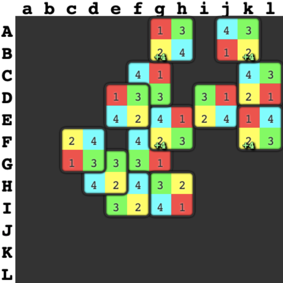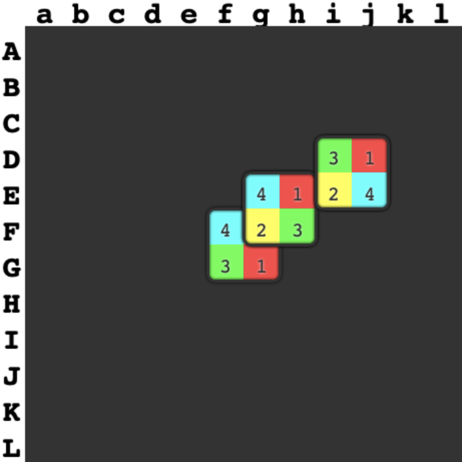 Squares wordt gespeeld door twee spelers op een bord van Het doel van het spel is om vierkanten met hoekpunten van je eigen kleur te vormen. Alleen vierkanten die evenwijdig zijn met de randen van het bord tellen mee. Grotere vierkanten leveren meer punten op, zie hieronder. Het spel gaat door tot er geen tegels meer op het bord geplaatst kunnen worden. De speler met de meeste punten wint. Het bordDe twaalf rijen worden aangeduid met de hoofdletters A tot en met L. De twaalf kolommen met de kleine letters a tot en met l. De tegelDe tegels in dit spel zijn allemaal vierkant en hebben precies 4 verschillende kleuren in een specifieke volgorde. Je mag de tegels draaien. Dit wordt aangegeven met een cijfer 0..3, 0 betekent geen draaiing, 1 betekent 90 graden met de klok mee, etc. Hieronder staan alle 4 draaiingen van de tegel "1234" aangegeven: