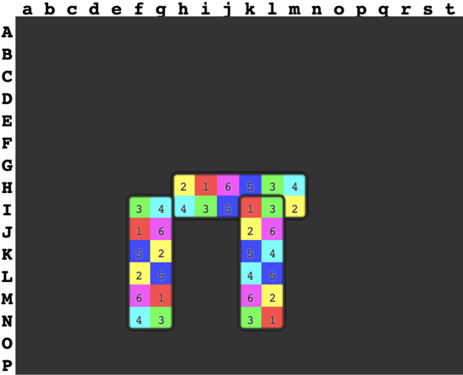 Both players first receive their secret color and the starting tile, which is placed in the middle of the board, in Figure 2 the tile "Hh216534h": is placed on spot Hh.